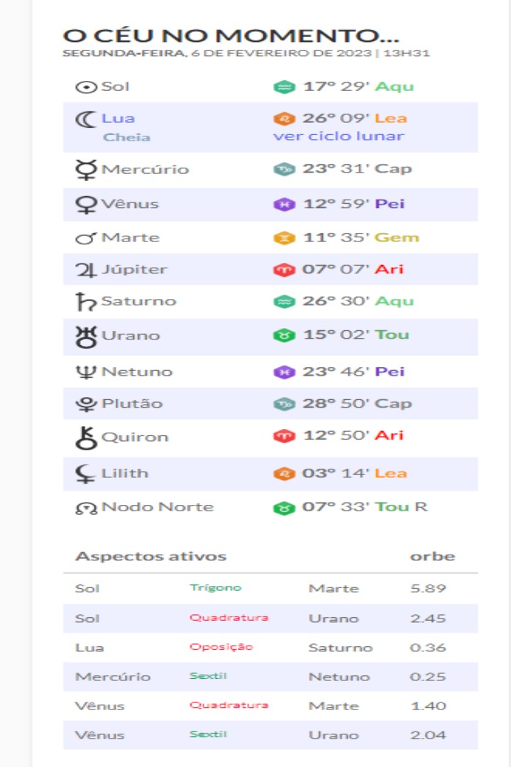Recurso ExclusivoDESBLOQUEAREste quadro mostra a condição que cada signo, planeta e casa possui em seu mapa astral, sendo parte integrante das informações que você leu acima. Você já se perguntou por quê algumas pessoas atribuem pesos diferentes para os diversos aspectos de sua personalidade ou desprendem mais ou menos energia em uma determinada área da vida? Isso acontece pois como você acompanhou até aqui, há diversas forças em jogo. Todo mapa astral é uma mistura variada de energias que criam uma configuração única, como uma espécie de DNA astral. Saiba mais.